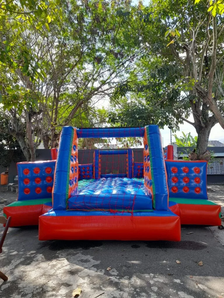 É uma estrutura inflável que simula um gol, mas com alvos ou buracos numerados para acertar com a bola de futebol. As crianças se revezam para chutar e testar sua habilidade de mira e precisão.